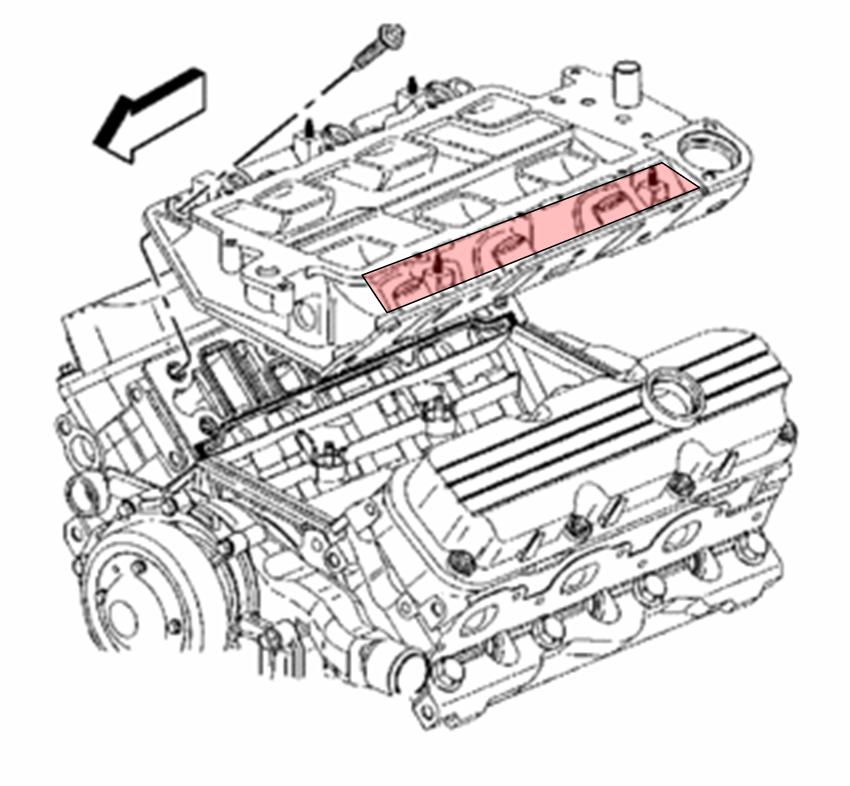 On the forward facing part of the engine, between the head and the upper intake there appeared to be a lot of wet debris and sand and stuff. So if my terminology is correct, this debris was sitting directly on the lower intake. To the touch, it was dirty and dark, possibly oil. See picture below for my awesome MS Paint skills. The red area is where the "wet" areas are.