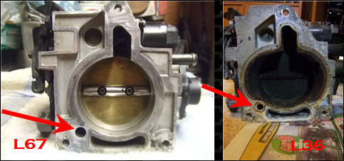 What I'm taking about does not matter if you use a L36 or L67 TB. Below is a shot of the outlet side of the L67 and L36 TBs. Where I drew a red arrow is a passage to get air that bypasses the throttle plate and feeds the L36 PCV system. The L26 UIM does NOT have a way to use this (as Turbo Monte said "the nipple port on the top of the l26 plenum will need to breath fresh air that is a crank case vent."). If it does not breath, I believe the write up I shared from the Bonneville forum mentions that you will have too much vacuum (this can become an issue).