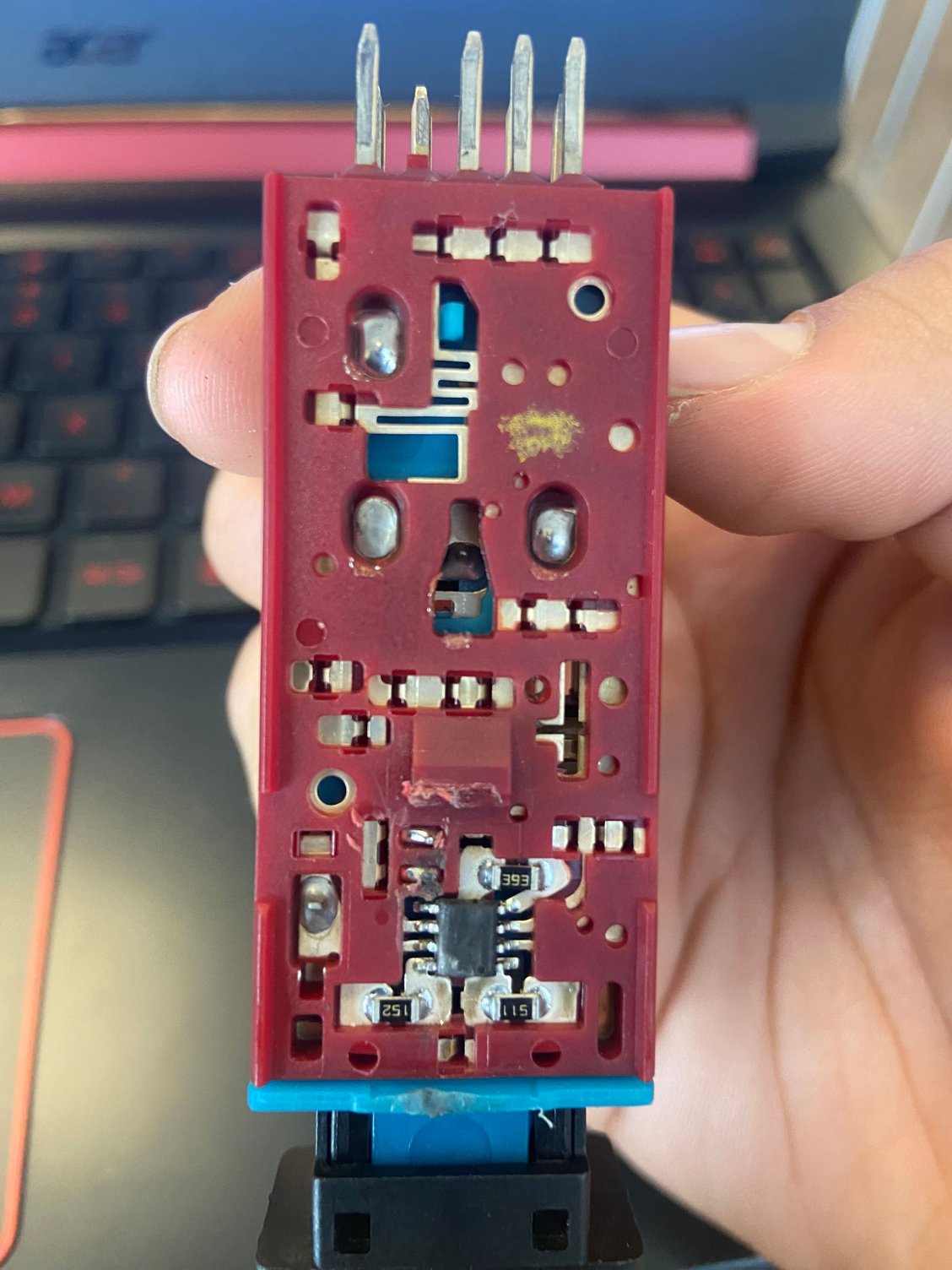 What you have is the same. I have opened a lot of these up over the past couple years doing mods. GM used two types of resistors over the years (and did not matter what car the unit was for). They used "surface mount" and "through hole". In my original post, I had a unit with "through hole" (but they mounted it like a surface). The unit you are holding is "surface mount". I believe most of the ones I have worked with are surface mount. You will see three black resistors all with a number value on them, these match to the resistors shown in my original pic. You have to remove the one behind the IC that has "393" written on it. I have not tried to mount "through hole" resistors to these, I have used surface mount (but you can do it, GM did it). You can also see in the pic of my modded unit, I used a surface mount resistor with the value "513" on it.