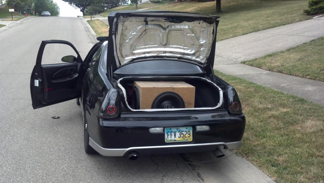 Got the box for my 2 15's built it is a back and side fire with two three inch ports going inti the cabin of the car. The previous plan was to have a box twice the size of this but the trunk latch and 6x9's got in the way, so it got cut in half and tis is the end product. Gonna eventually paint or carpet the box.