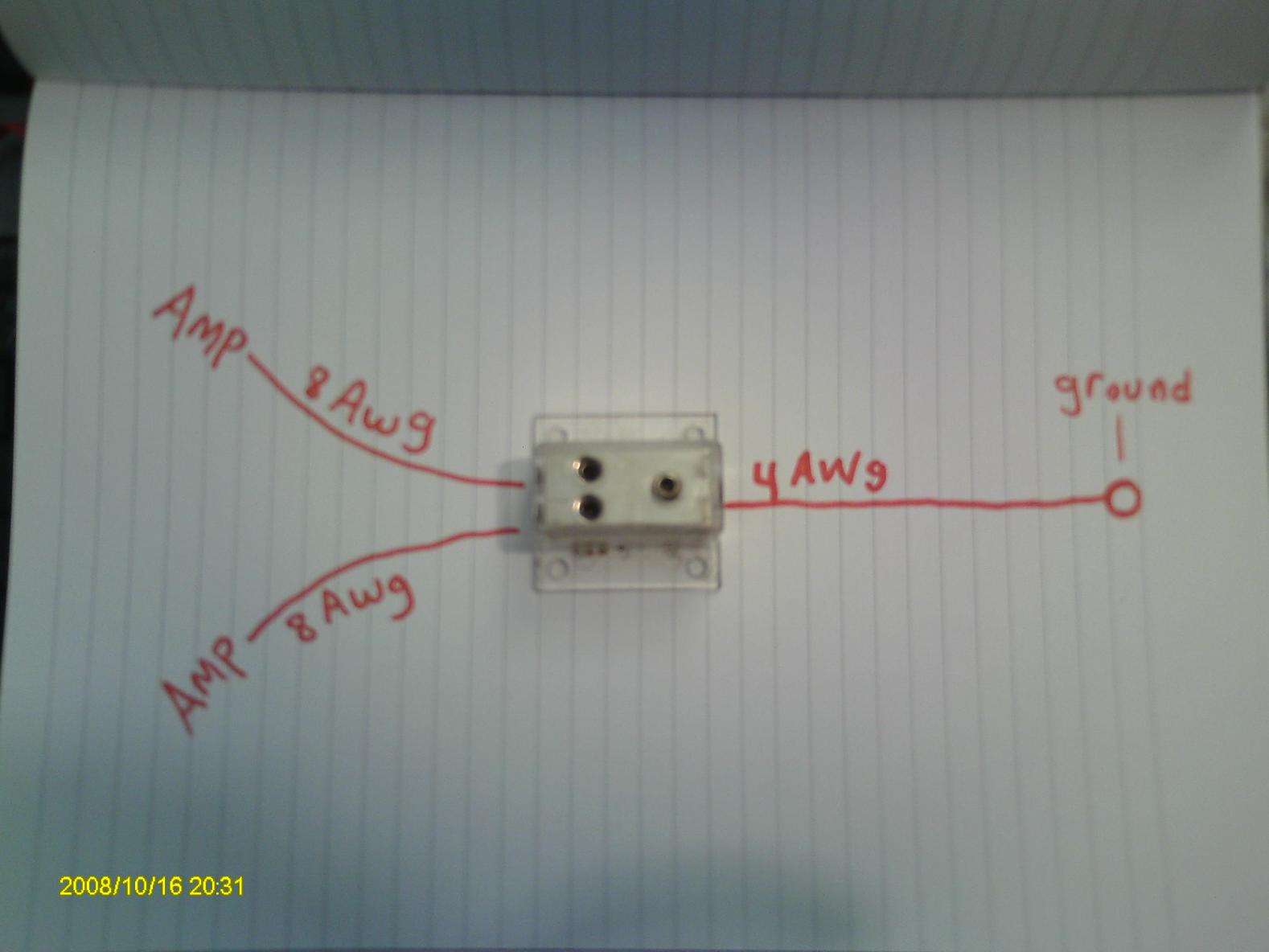 in the picture below, you can kind of see how i branched 2 power wires off of the cap to the amps, and the grounds from the amps also when to the cap, off of the cap there is 4 ga power, connected to the battery and ground point, and there is the 8 ga wires to the amps, so you need to make sure the main power wire is enough to handle the wattage of the amps, along with the ground.