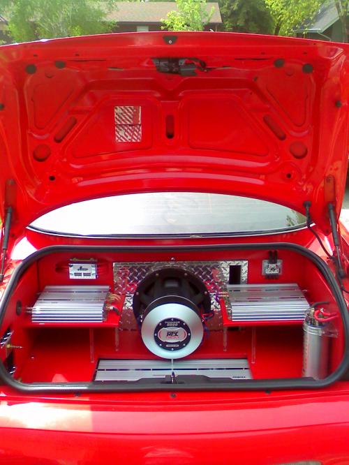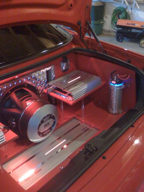 I don't have a good pic of the cable going out back, but it runs from the front battery positive post, thru a 50 amp fuse, to the back, thru another 50 amp fuse, and to the battery, along with everything else. I am NOT running a battery isolator, altho I do have one for it. I had it in, and took it back out. Basically I am running 2 batteries for the whole car.