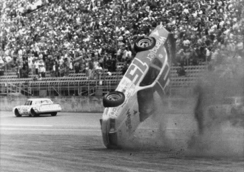 Ricky Rudd was pretty beat up after this ride. His face was swollen so bad they had to tape his eyes open to run the Daytona 500 the next week. But he became known for his toughness after this accident.