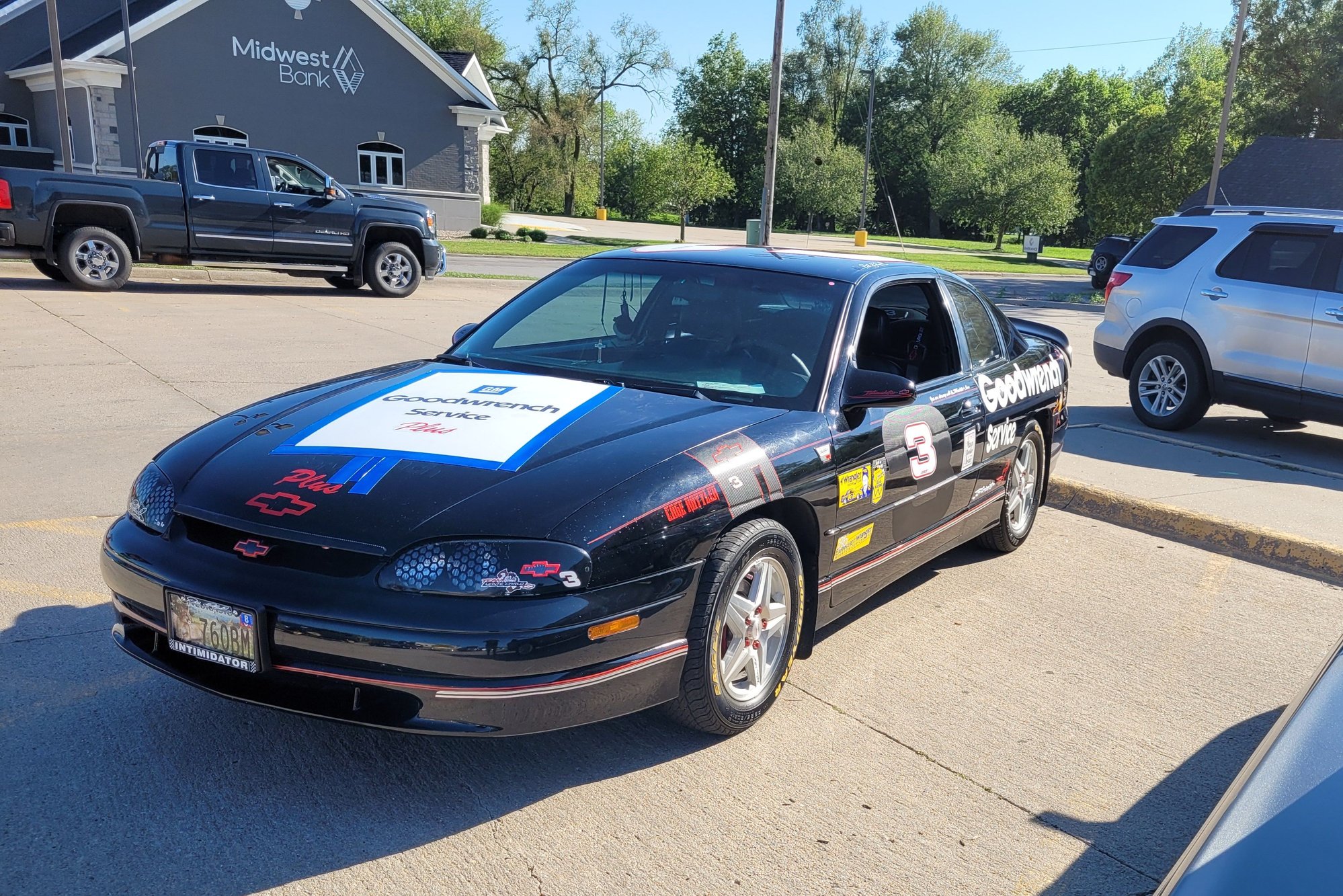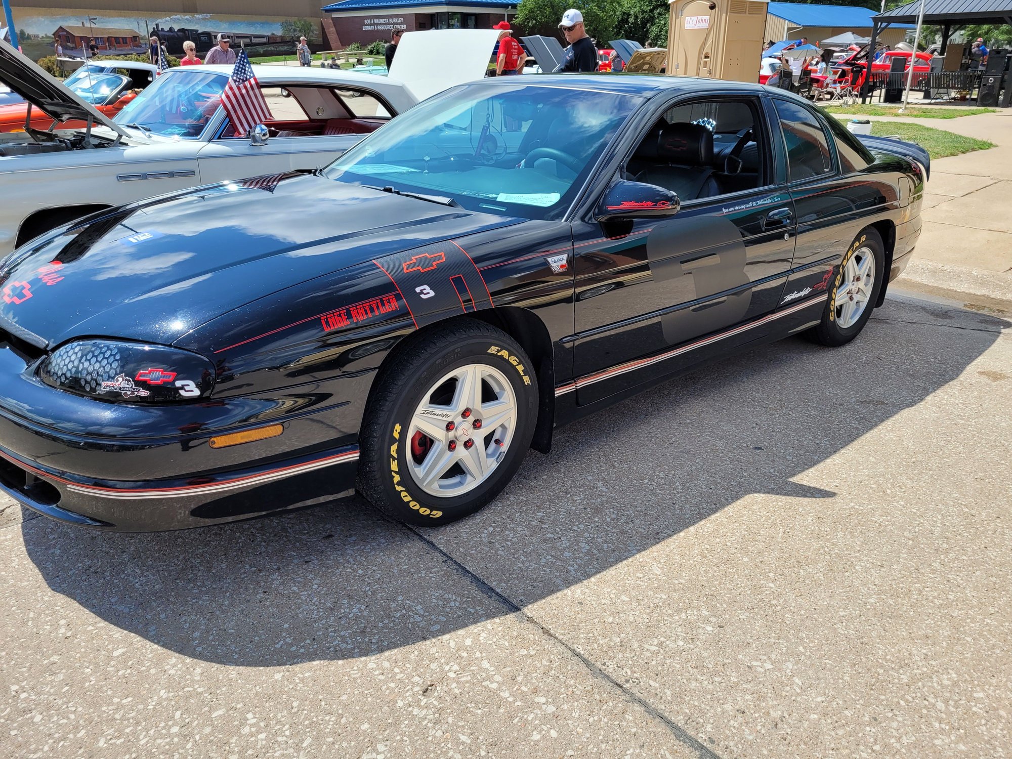 There is a full size ghosted #3 on the door with the little three on top this stuff is all magnetic this has the Cage Rattler hood look one of my carshow displays On the door is says ( You are driving with the Indimidators Twin) Headlight cover bling Ghosted #3 on the door Display with the Mini 3 Car