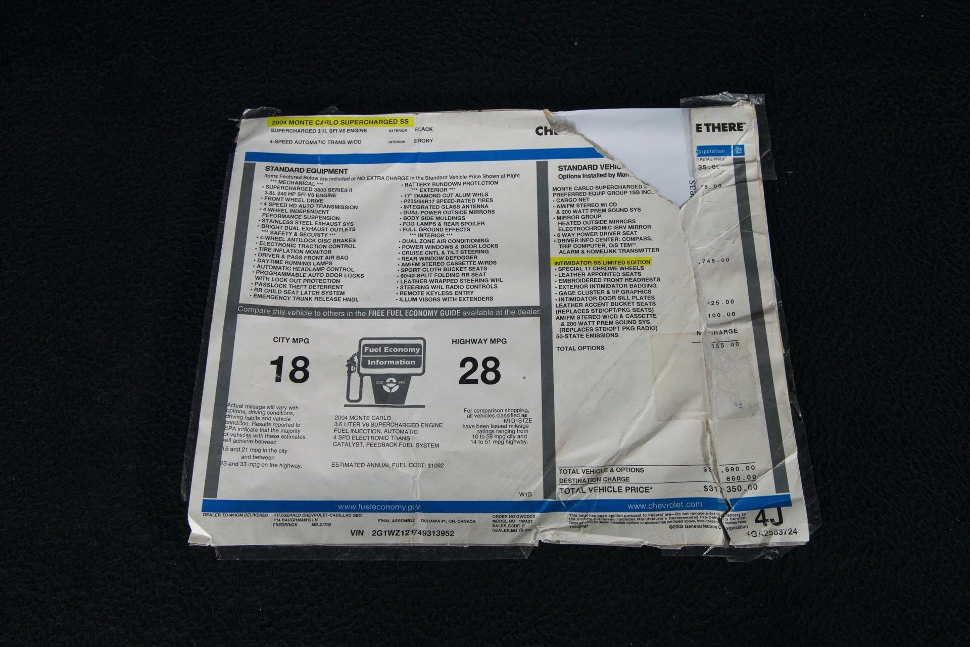 FYI - Despite one or two places on that Monte saying Dale's nick name "Intimidator", you have a Dale Earnhardt Sr Signature Edition Monte. The only true factory issues Intimidator is all black and was released in 2004 with a supercharged 3800. You can confirm all of this by comparing the information on the factory window stickers, the COA (Certificate of Authenticity) and the sales literature for the different cars.
