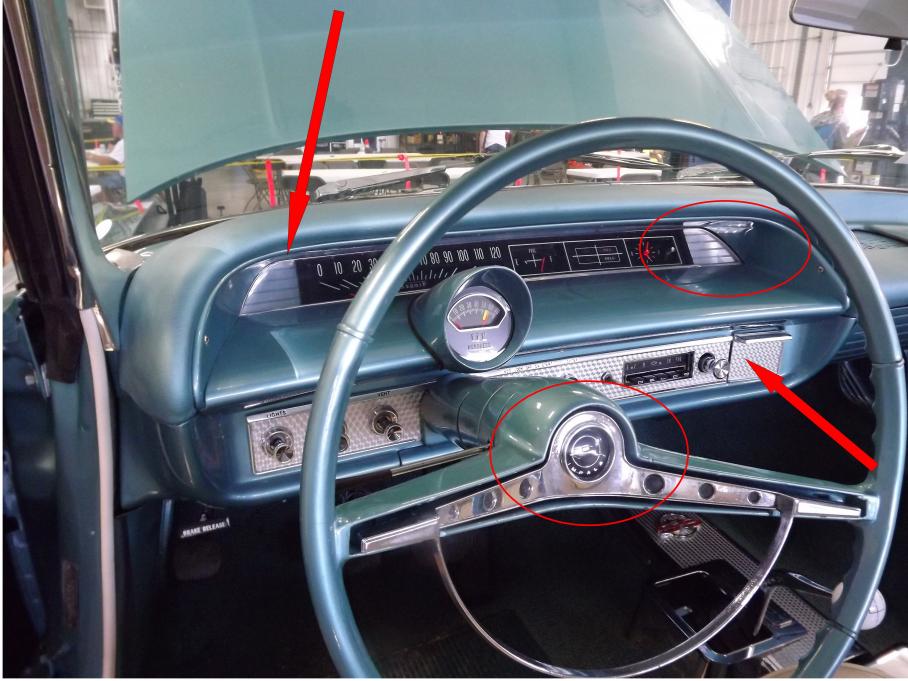 I have added the photo of the dash, The Horn ring says Impala on this one and I circled the locations on the Dash to check, Note: that the RED Arrows show the difference in the Dash and the Speedometer trim ends.