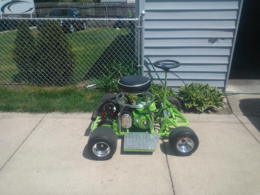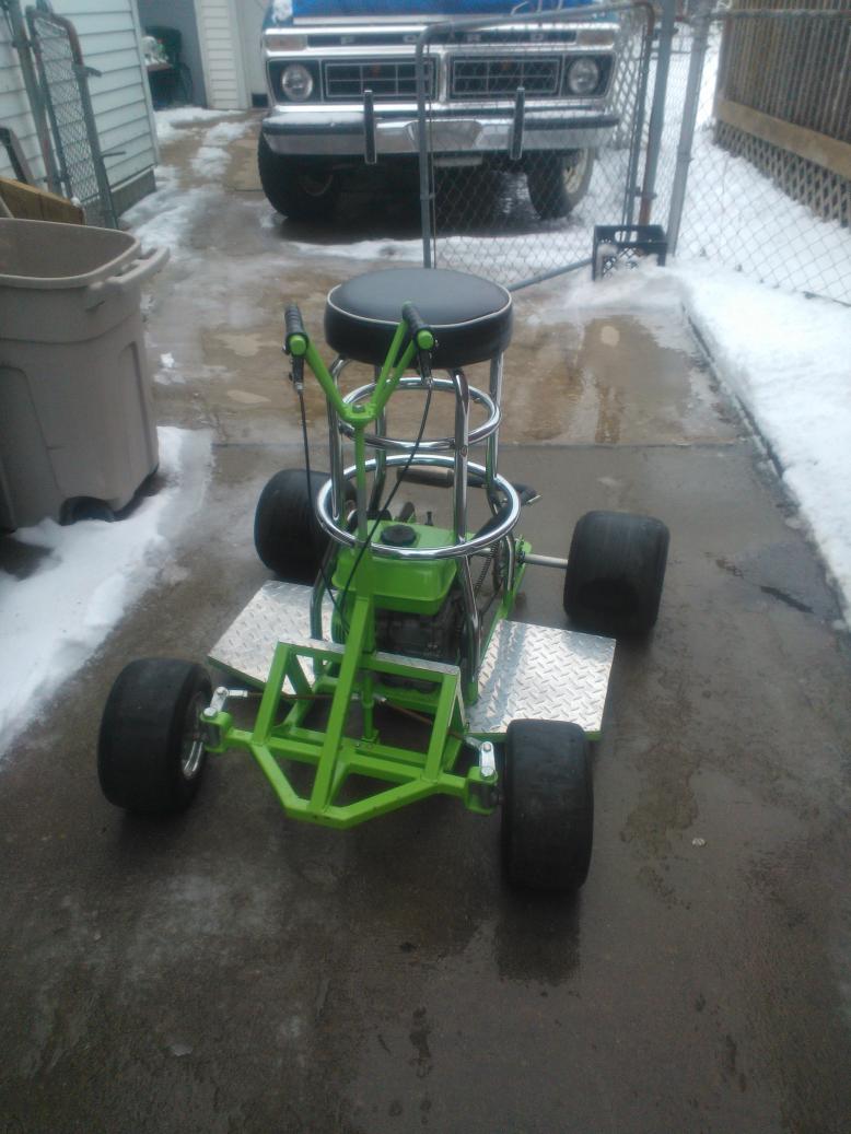 Its basically a racing GoKart with a barstool seat!...(home made frame)