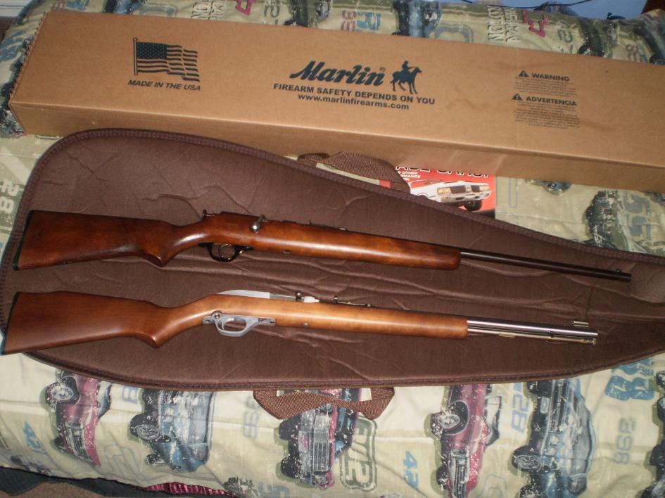my two lil plinking guns, bottem is my Marlin model 60SB .22LR, which i've scince added a cheap tasco 3-7x scope to, top is my grandfathers old JC Higgins single shot .22LR he used for critter control in his garden. both are a blast to shoot i'm hoping to add a shotgun to my collection sometime soon.