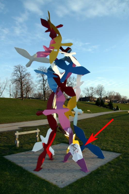 One of the afore mentioned sculptures in "The Odette Sculpture Garden". These are supposed to be a flock of birds taking off. The shirt is pointed out by the arrow. The wind was really blowing hard in this picture. I had to place the shirt quickly and take the picture before the wind took the shirt and put it in the river.