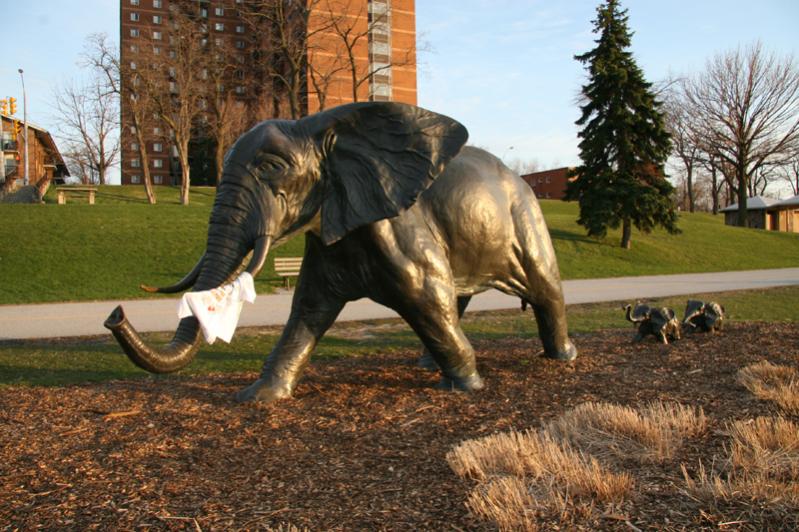 This is a bronze sculpture of a mother elephant with two young elephants. They say it's supposed to be life size. But I highly doubt it. Shirt is on the right tusk.