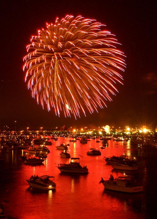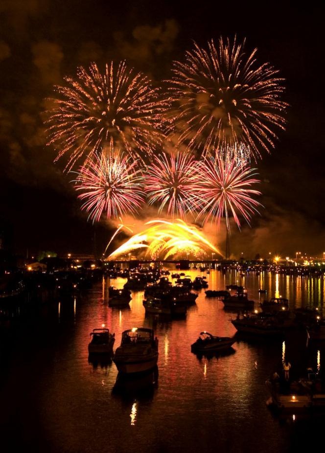 Heres some pics from the Fireworks festival in the past. Our town is devided by a river and the festival in on both sides in the parks. It's always lined with boats.