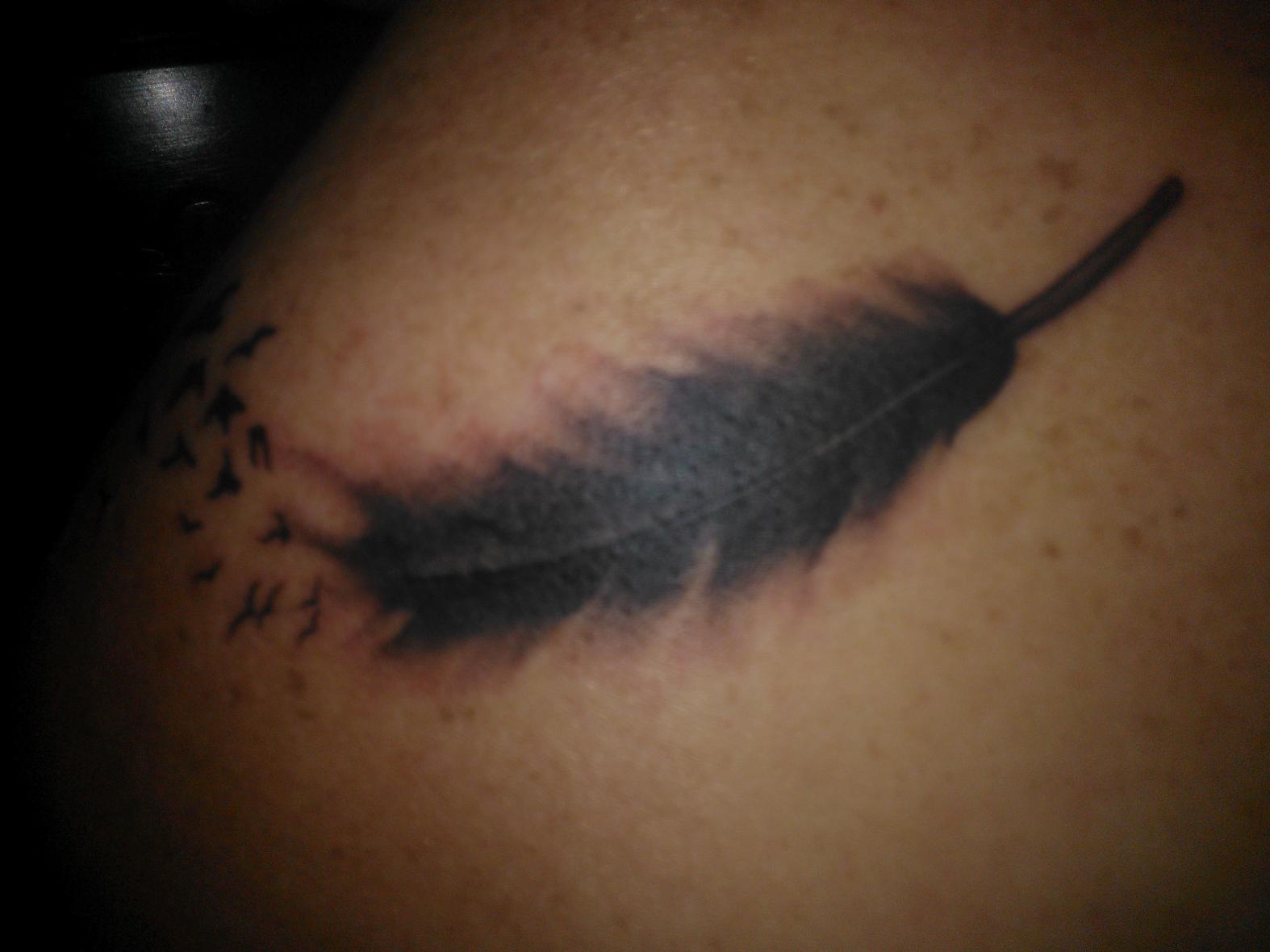 It represents family, and the added birds that are flying away from the feather represent the freedom of life and the paths that her family has taken.. Free to live life in there own way... Pretty cool if you ask me!