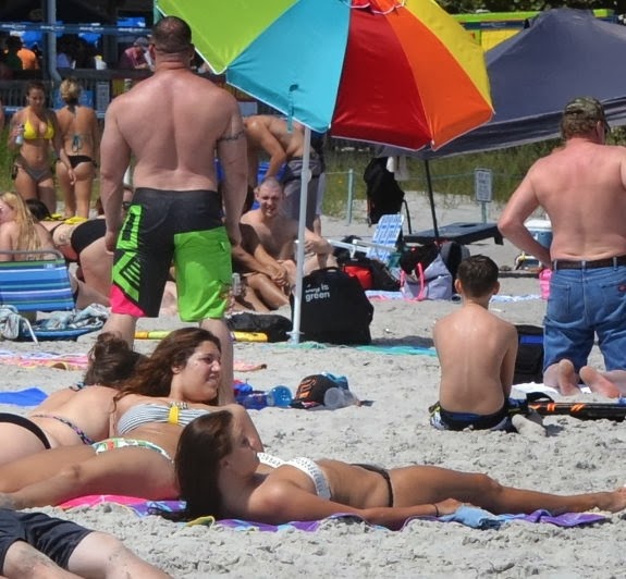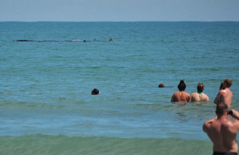 COCOA BEACH, Florida -- A mother and calf, part of a group of migrating Right Whales, along with a few bottlenose dolphins, showed up Tuesday afternoon just a couple hundred yards off the coast from Coconuts on the Beach at the end of Minuteman Causeway in Cocoa Beach, Florida - a popular hangout for the college crowd, including 2014 Spring Breakers.