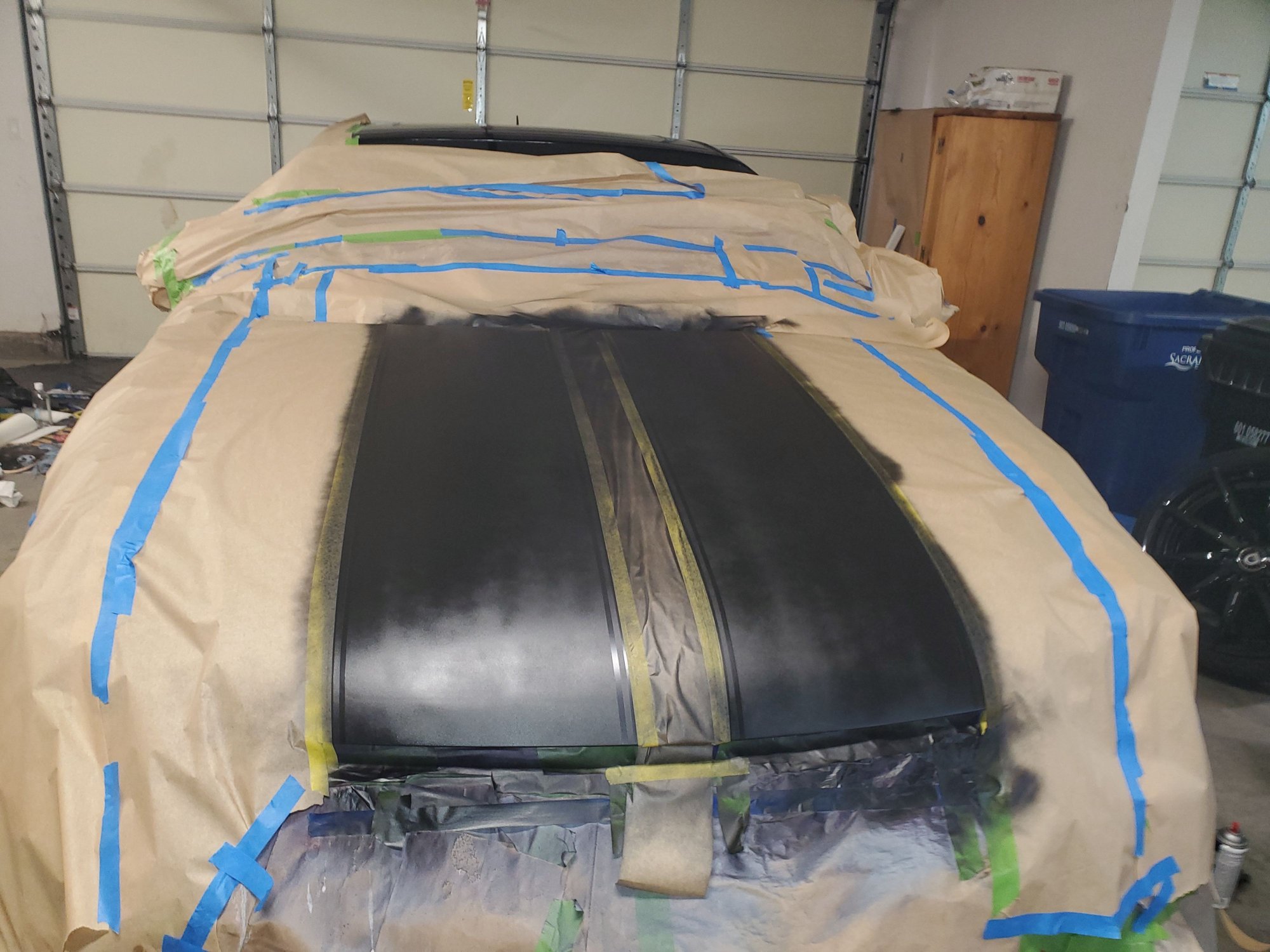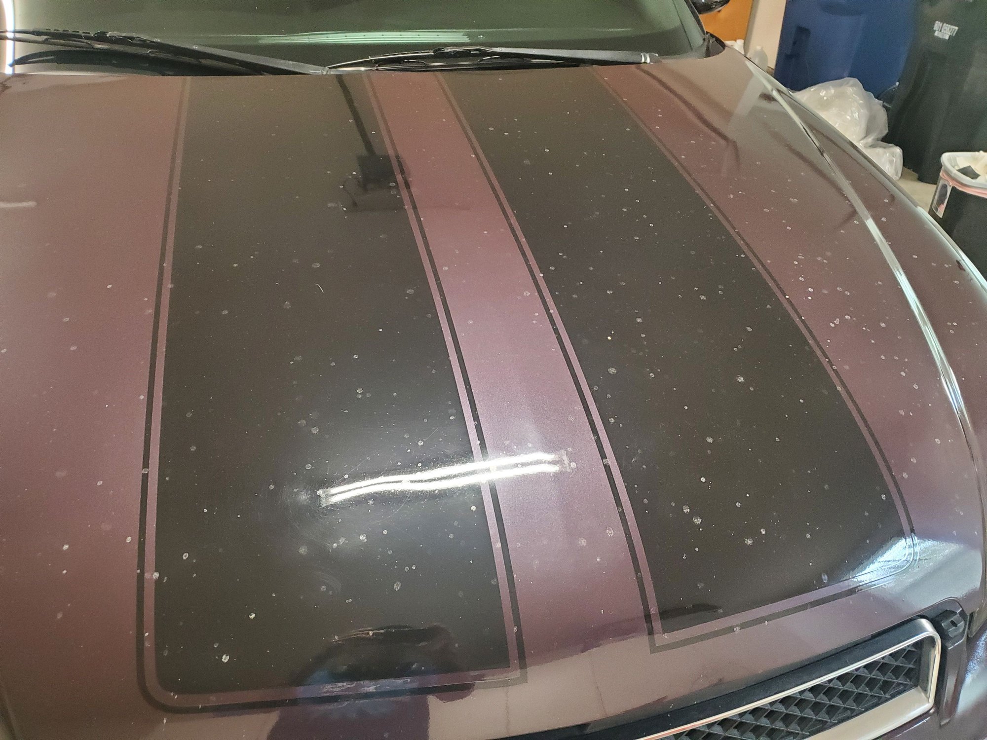 Car was sitting 2 years under a tree. The hood had an extreme sap issue. Not sure what kind of tree. Went to a couple detail shops they either sent me away or said use 3000 grit paper to get the spots out. Well I tried every kind of wax, polish, compund, etc then finally got some 3k grit and tried it. Still nothing!! I was really embarrassed about these spots all over the hood so went and got some quotes for painting it. The average was $1200!! I've painted cars before and done body work but i'm definately no pro and its hard to be good at bodywork/paint but I thought I really don't want to spend in excess ok $1k for a hood. I started asking around at the most recommended paint shop about how much it would cost to do this. I was confident but the only problem was the stripes which I've never done and a body shop told me they don't even do them they send the hood out for that. Anyways I will show before, during and after pics. I used a 2 stage base coat/clear. The hardest or at least most tedious part was the prep and masking. I measured the stripes exactly on the passengers side then got so annoyed half way through the drivers side tbh I eyed it but I think it came out fine. So for under $300 worth of supplies and the feeling of doing something yourself here are the pics. Oh and before when I literally 1st got the car I wanted to address some rock chips in the front bumper. Well knowing me I went to the extreme and sanded down the whole bumper so I had a to paint that 1st actually which gave me some motivation. I think the paint also matched pretty well too. As you can see even after sanding with I think as low as 400 grit the spots still showed. Jeez.... Anyways I eventually got them out. Let me know what you think and if you need any pointers or what grit I used at what point or brands I used. Thanks. I will upload the photos in order.