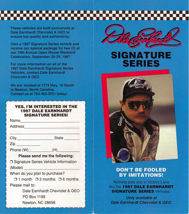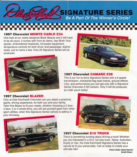 The 1997 Dale Earnhardt Signature Series Monte Carlo, this year the overall color was Black with red accent stripes on the lower portion of the car. I am attaching a brochure for reference