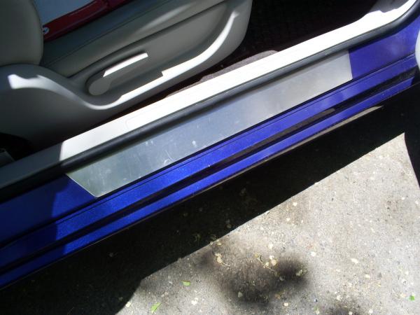 i made my door sills out of some extra stainless i found laying around at work. they serve more for looks than function but i like them. the part that took me the longest was buffing them up with a red scotchbrite pad for a brushed look. then a little 3M double sided tape and they were on. this particular pic isn't the greatest since they're a little dirty right now, but you get the idea.