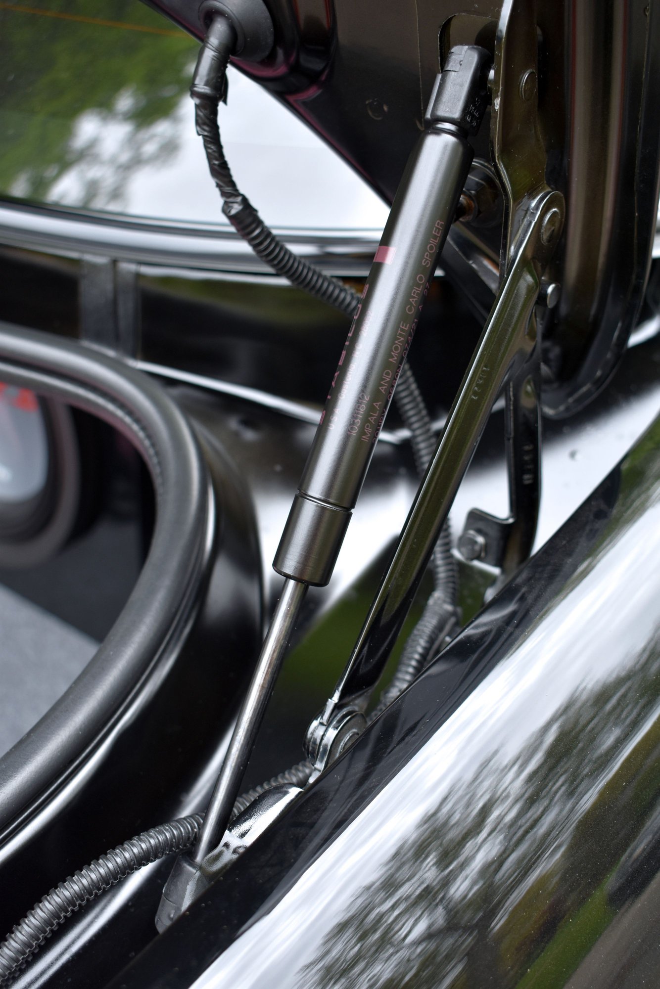 And a couple shots of the new trunk struts and new hood strut and hood liner reinstalled. First pic shows an original trunk strut (top) and one of the Genuine GM replacements (bottom).
