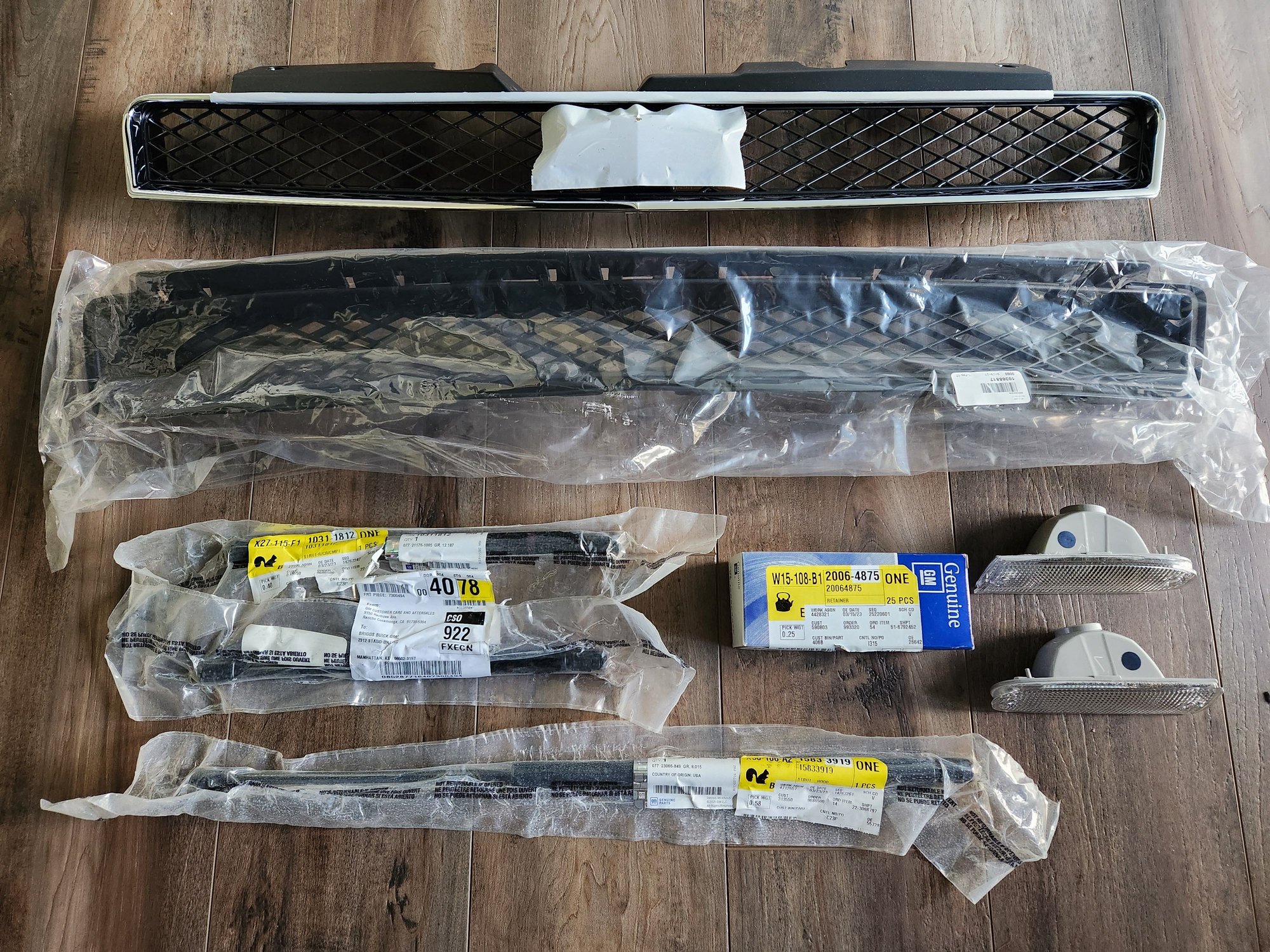 Pictured here is the new upper grille, lower grille, trunk lid support struts, hood support strut, backup lights and hood insulator retainers (all OEMs).