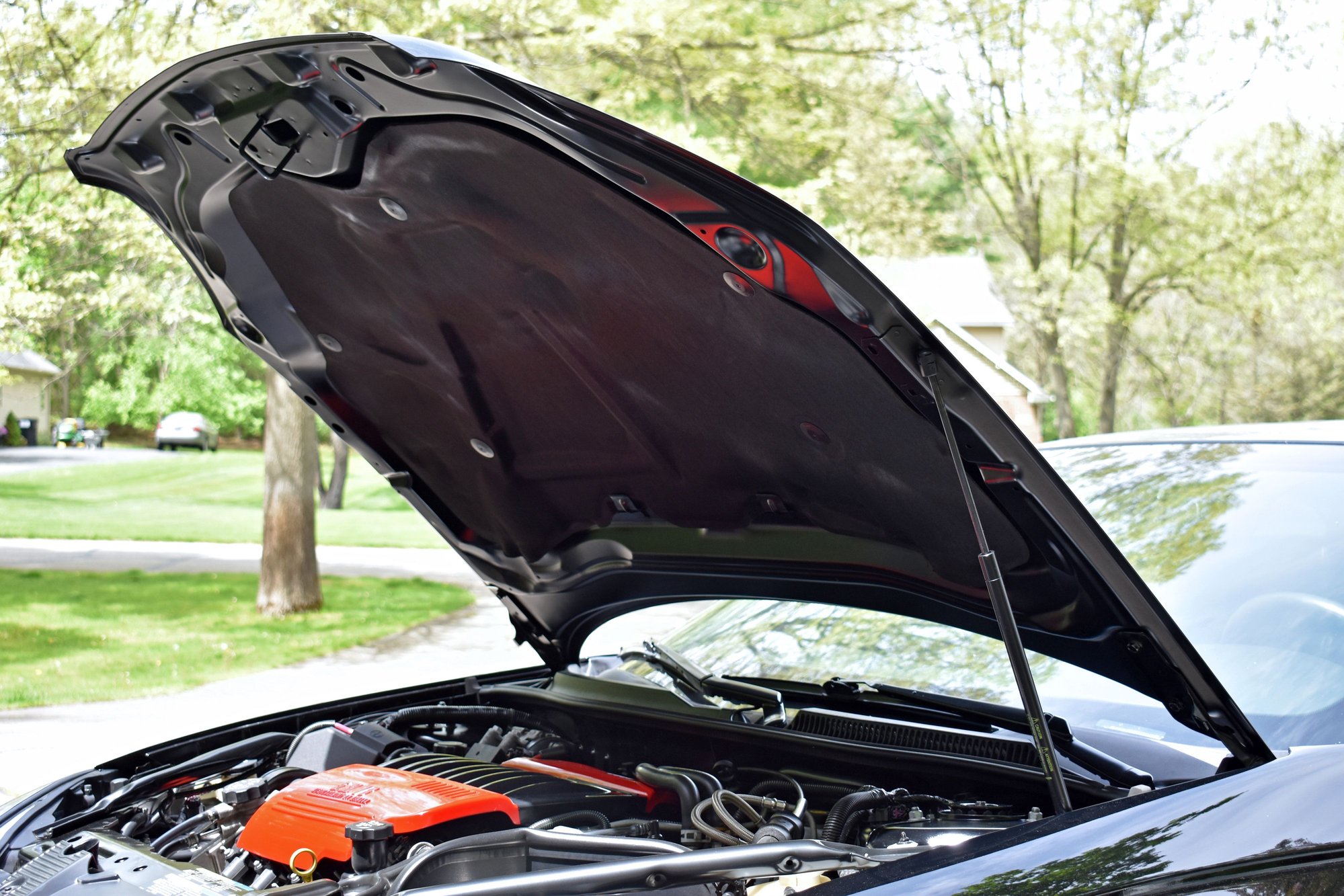 Here she is after the front repairs were completed! I dropped the car off at the shop last Tuesday and they were done by mid-morning Friday. He absolutely hit it out of the park again with an unbelievable paint job that matches perfectly - he even matched the factory paint sheen on the underside of the new hood. And, since this was the perfect opportunity, I decided to replace a few additional parts that weren't damaged in this incident but were showing their age**.