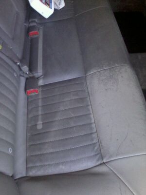 Wouldn't do any good to sue him. He now has nothing including a place to live. His girlfriend kicked him out, He is a good friend of mine but now I am not so sure. Havent talked to him since I picked it up. I will be finished putting it back together this evening. Then wet sanding and buffing after that. It will look very nice when I am done, just the BS I have to go thru to get there. I read about olive oil. Might try that. It is coming off but it is a task and unsure what the reducer will do to the seats. Here is a pic of backseat. It is worse than the fronts, you can see where I cleaned.
