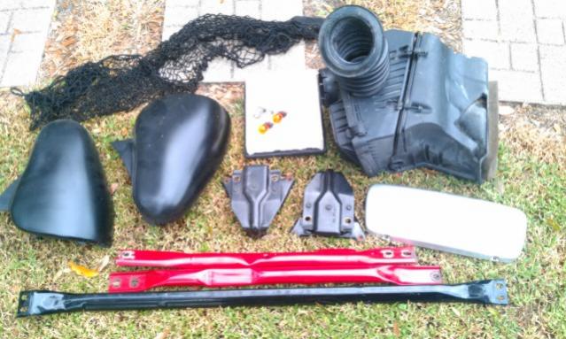 Eng mounts air intake lic plate thing that goes on front bumper brake light housing blacked out air filter brake and turning light bulbs net that's goes in trunk ask for price I'm not sure what there worth