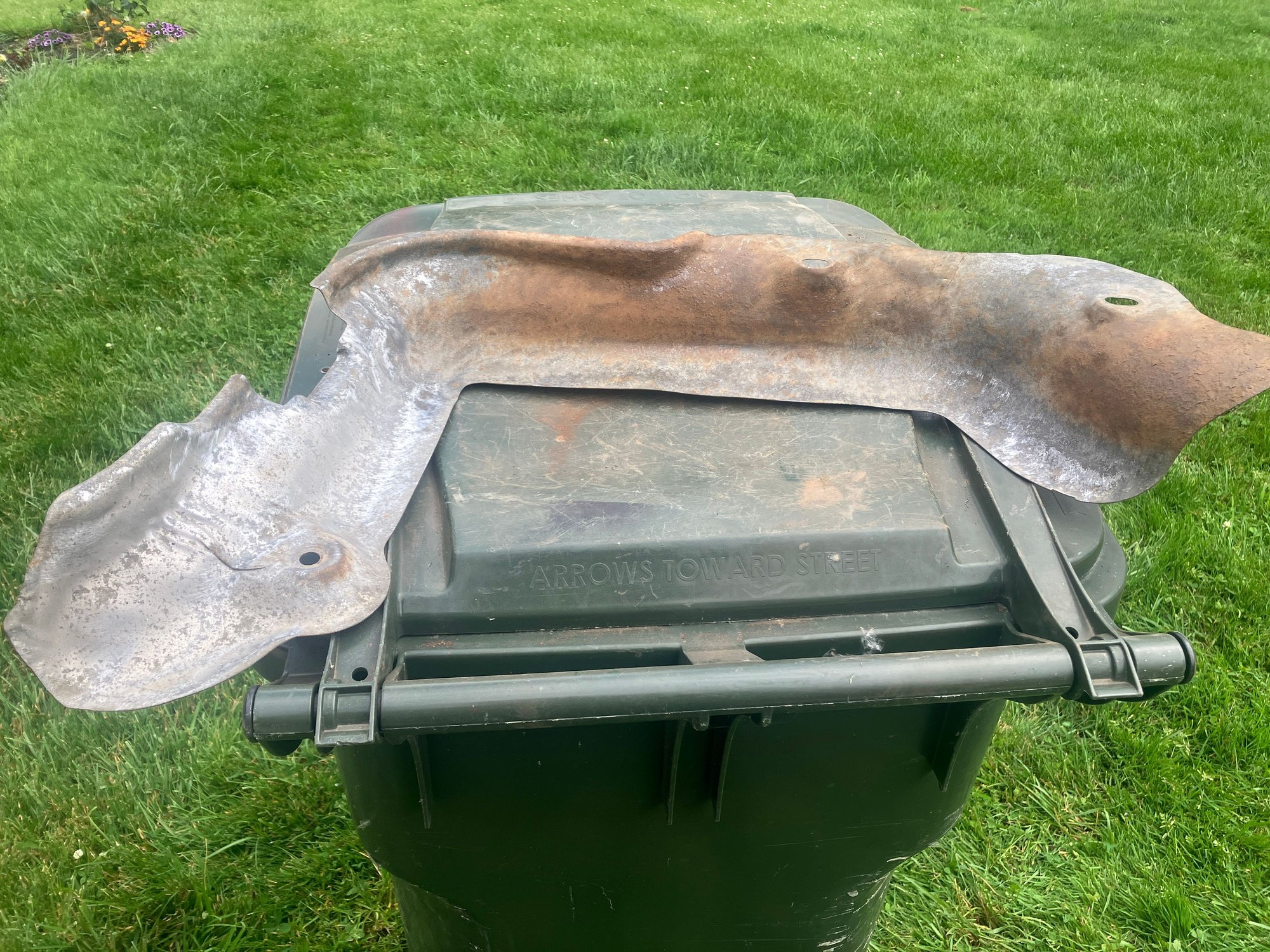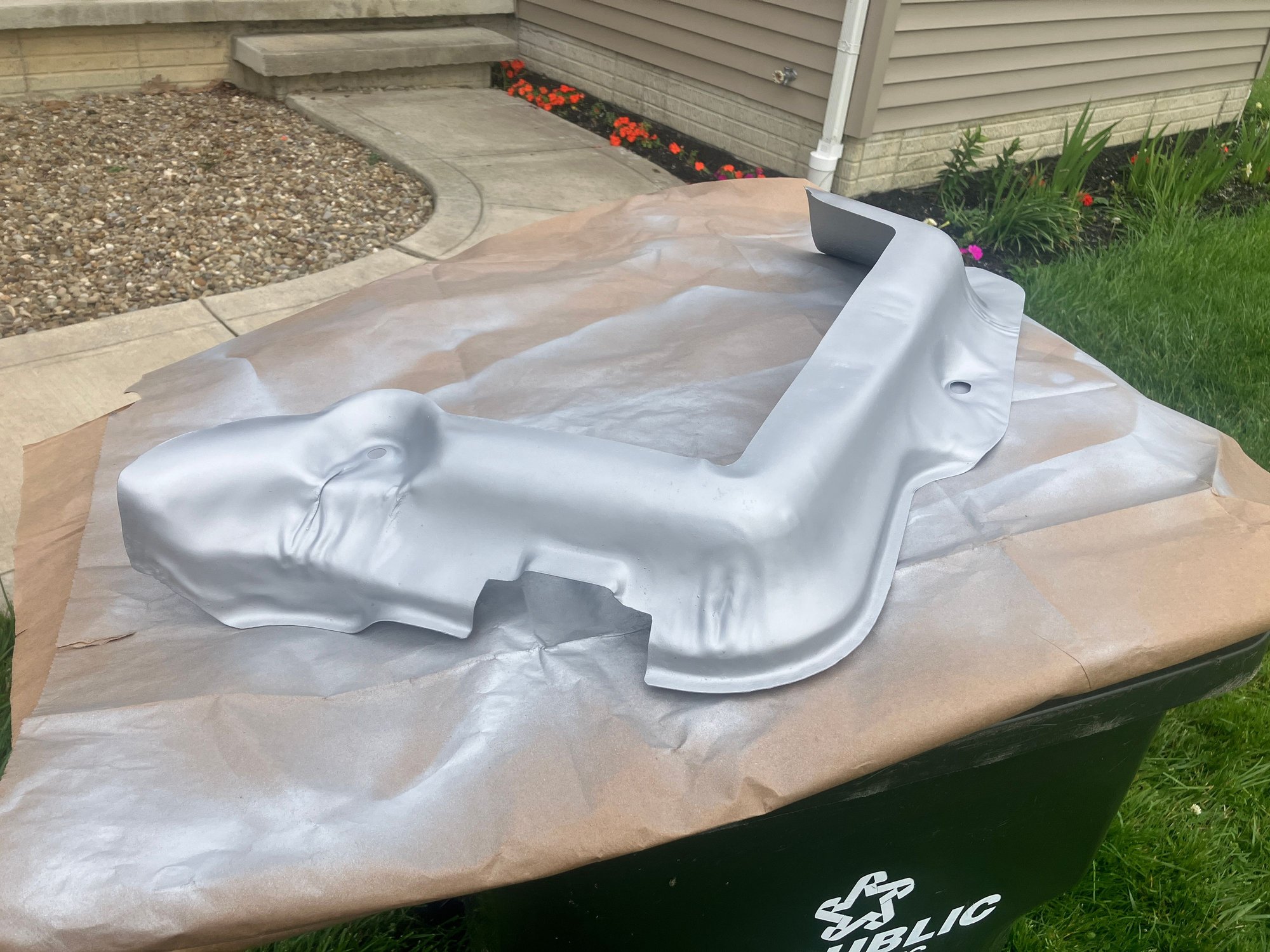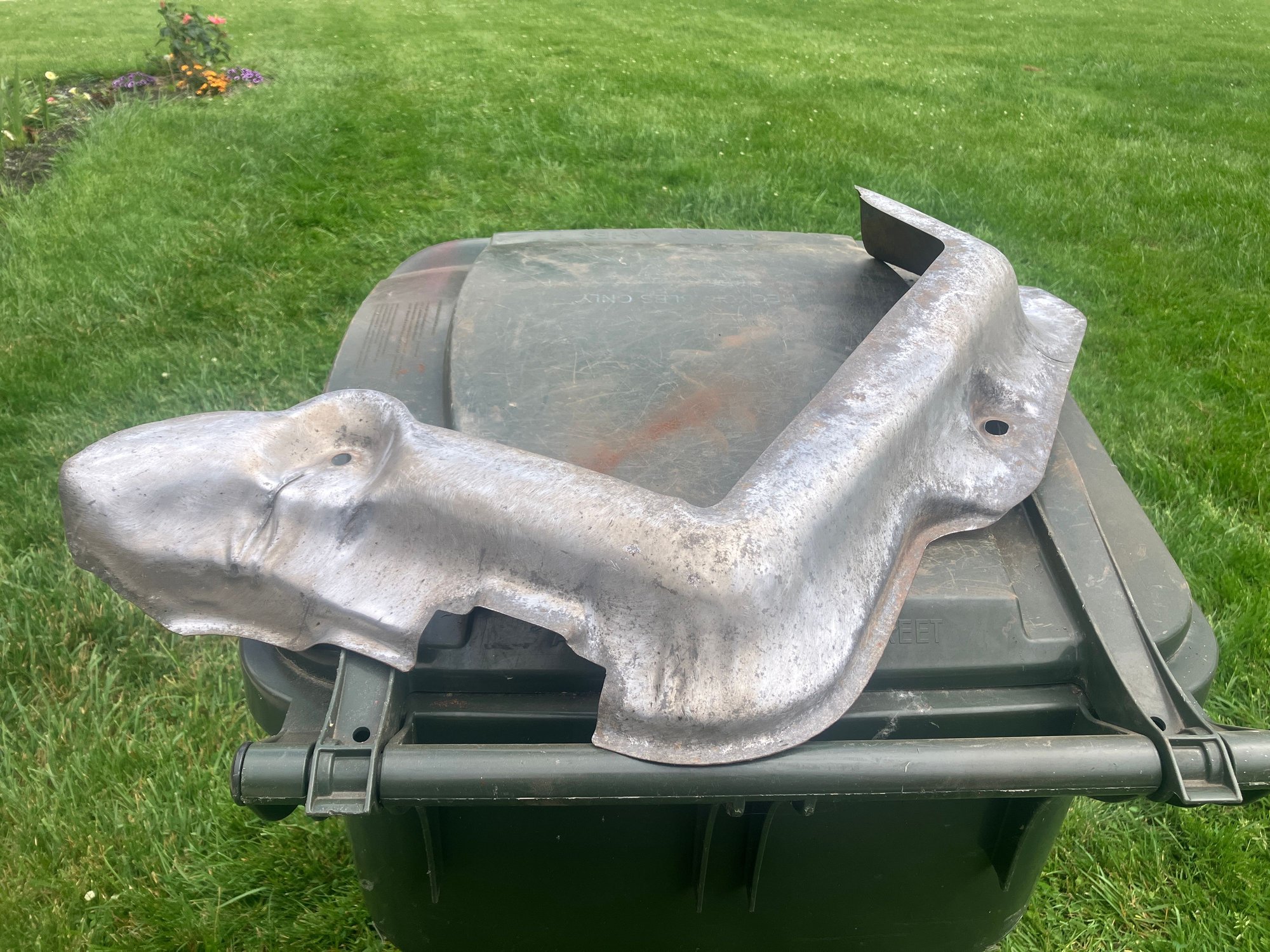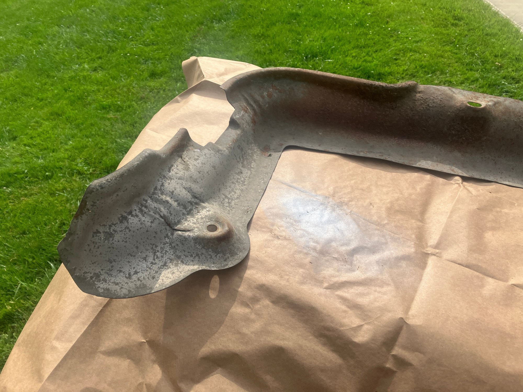 The black Monte is in need of a replacement heat shield around the gas tank. Sadly, the part is discontinued. I was surprised to find two at Pull-A-Part that were decent/re-usaable. I grabbed them both. I took the worst of the two, hit it wire wheel and then hit with some "Rust Fix" and top coat with high temp spray paint. The rust seen was surface rust, barely worn through the coating on it.